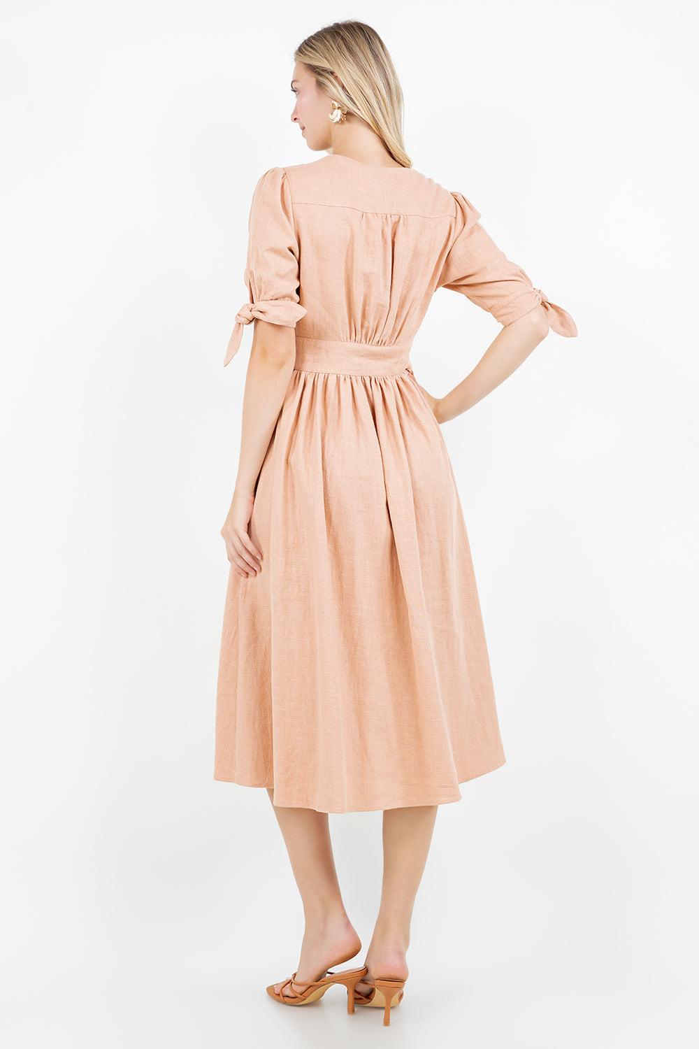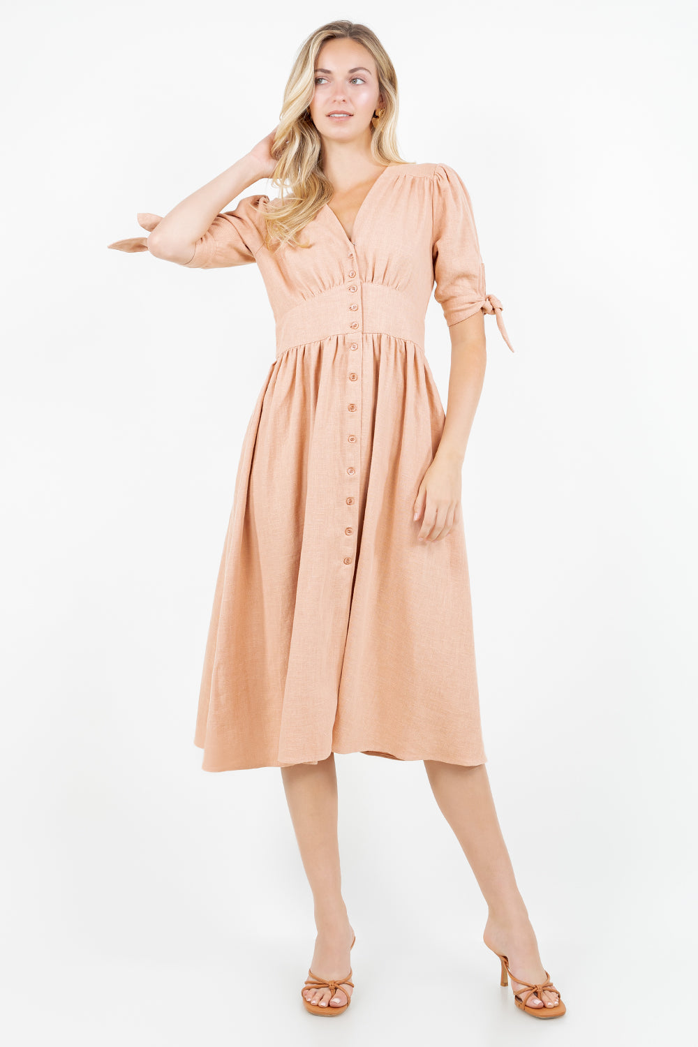 Breathable cotton-linen midi dress with button-front closure and puff sleeves. Features V-neckline, gathered bust, defined waistband, and relaxed midi skirt for a flattering fit. Lightweight fabric offers all-day comfort — perfect for boutique-ready transitional or everyday styling.