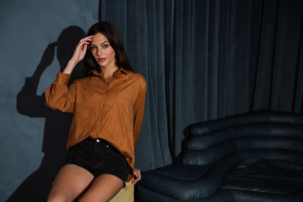 Western inspired button up shirt in soft vegan stretch suede. Features curved western seam details at the front a classic collar and long sleeves with button cuffs. A relaxed yet polished silhouette makes it a boutique ready essential for elevated everyday styling.